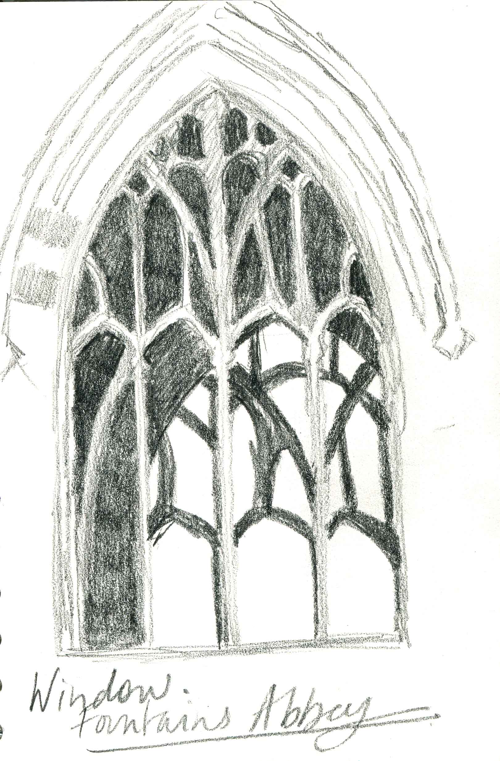 This is one of the sketches; I was taken with the two windows on opposite sides of the tower which I guess are identical. I drew what I saw but looking at it now it can’t be right unless the building is not symmetrical. I still like the offset clash of the two versions of the same thing.As I drew it I tried to break it down into manageable observable sections. A proper architectural artist would have a better knowledge of the structure and it would look more real as a result. However I am pleased with the effect of the two patterns overlaid even if the far side would be unbuildable from what was observed and recorded. It could of course be reworked into an etching, drypoint or collagraph.