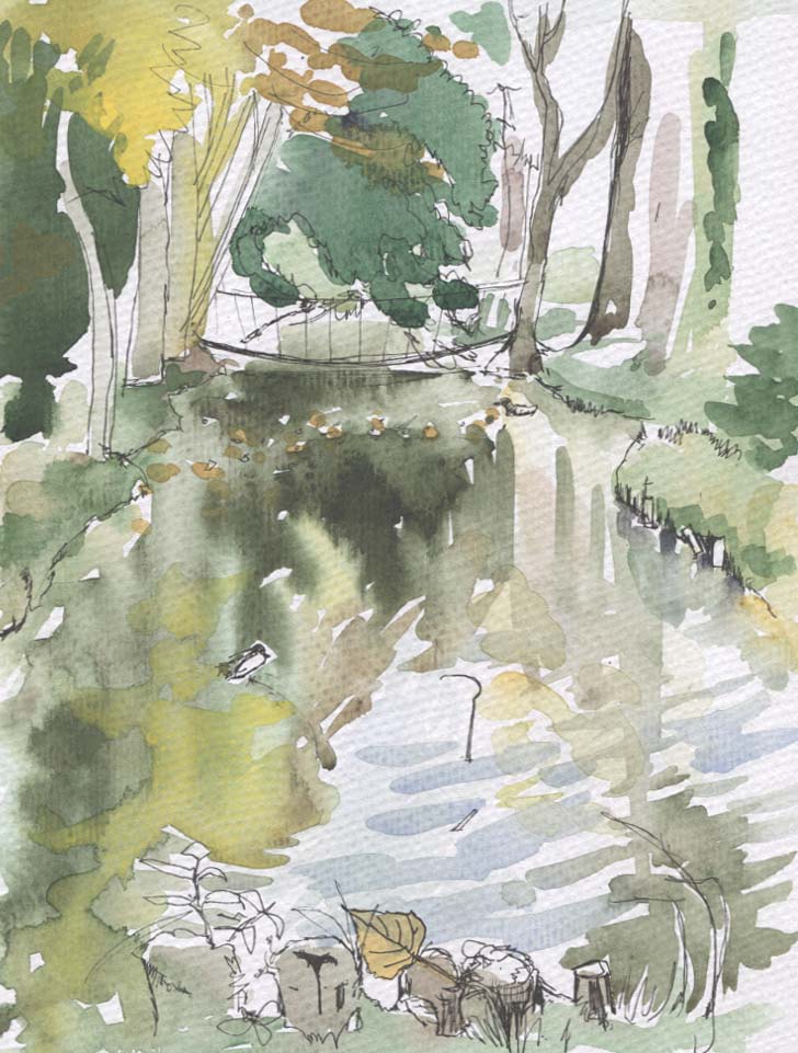 It was far too hot and crowded to paint there, I did try but it was hopeless. However at Chateau Canon the atmosphere was calm and tranquil and the garden has progressed since we last visited, then things looked precarious after the Boxing Day storm had brought trees crashing through the walls. It is a garden made during the transition from French formality to English romanticism, the best part is a Chartreuse- a series of interlinked walled gardens which were built to grow fruit. There is still much to restore but it is beautiful. I have never seen such gorgeous rainbow trout 18 inches long in perfect clear water.