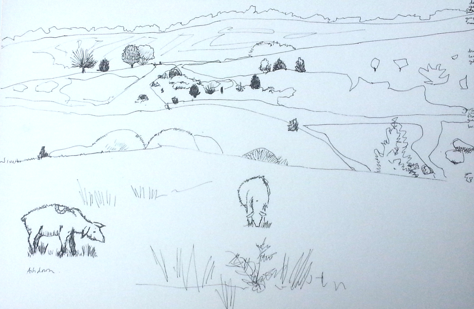 This was a lousy photo of a sketch- lousy because light levels are low. I have fiddled with it digitally and it helps a little with my rather bad sheep…my excuse is that they kept moving and that I did not have very long, the landscape was lovely though, it’s such a patchwork of colours.