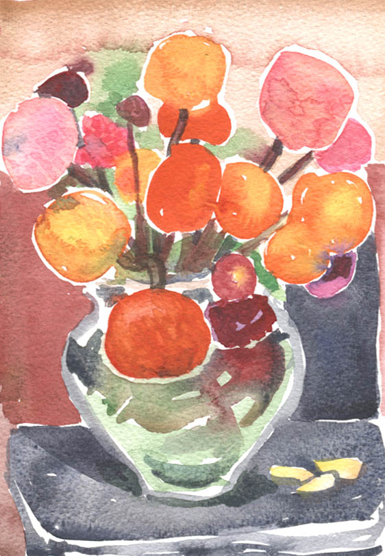 These pompom dahlias are so bright it almost hurts the eye. I sketched them last week- it was so mild they are sitting on top of the stove which was clearly not needed. I was lucky enough to be invited to pick some of the seasons end prize winning dahlias by one of the best allotment holders.