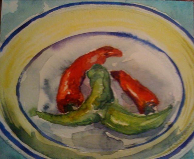 Red and green chillis in a yellow bowl – a painting a day