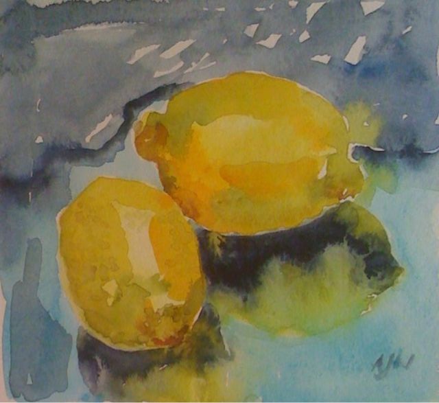 I moved the lemons and did them in extreme wet on wet, I like the random way the paint flows sometimes, ok not entirely random, if it goes in completely the wrong direction I just blot it up with bog roll and try again or tip the pad so it flows off somewhere better.