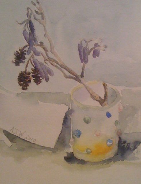 These are alder catkins and the painting did not really flow very well at all, for a while I thought it looked like something I would have done for a weekend’s homework at school, however it does show the mad colour that I found in the catkins which are hard and unopened…purple! I had never noticed this before; the alder trees grow on the edge of the school playing field close to the bed of the underground spring that makes our allotment a sodden mess in the winter. I actually think we should get some sort of rebate as when marshland rushes start self sowing and growing strongly on your plot it is telling you that it’s not ideal for fruit and veg.
