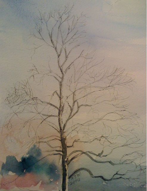 The birch tree was even taller and thinner than in the picture it continued down, but the best bit was this bit against the sky. There are so many tiny branches on trees like this that it would be madness to try and paint them all so I have tried to get an impression of busyness.