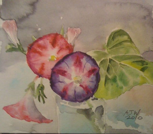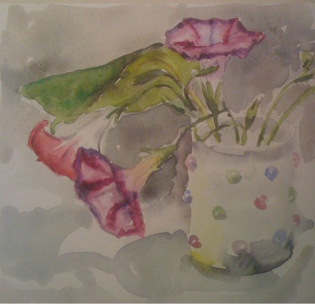 My painting today is of the morning glory, it will not be for sale yet as it may have a taker already. The morning glory plants are now in full flower (they were sown very late). There are three colours and they are great every morning as long as the night has not been too cold. I have also found that the buds will open for several days if a stem is put in a vase.
