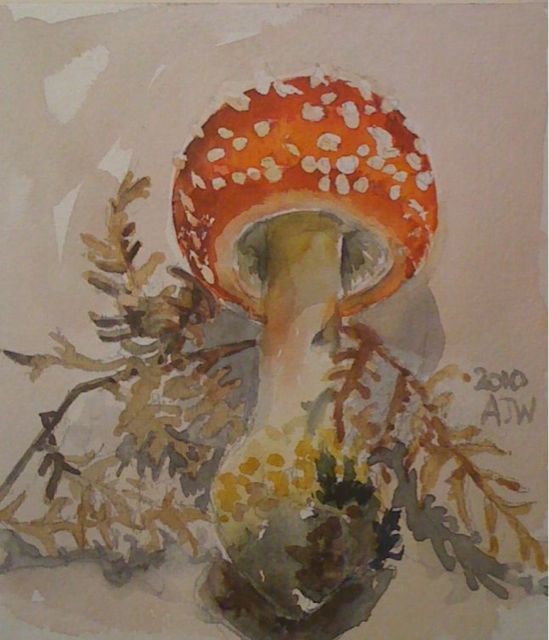 We went for a different walk today, if we had been there a couple of days ago there had been some very fine ceps, as it was they were huge and home to millions of tiny maggots.. In fact on the way back from the community orchard I saw a cep by the pavement only a few minutes walk from here. They really are everywhere. Instead of edible fungi we picked paintable fungi and here is my first effort. I don’t think I have drawn one of these since I was at school. Amanita’s are classics of the fungi world, tall, well formed and successful they are in the main poisonous or very dubious, some will kill you, this could make you pretty ill with the possibility of some hallucinations depending on the weather…..the suggestion is that the toxin/hallucinogen varies in strength according to the type of year it has been.