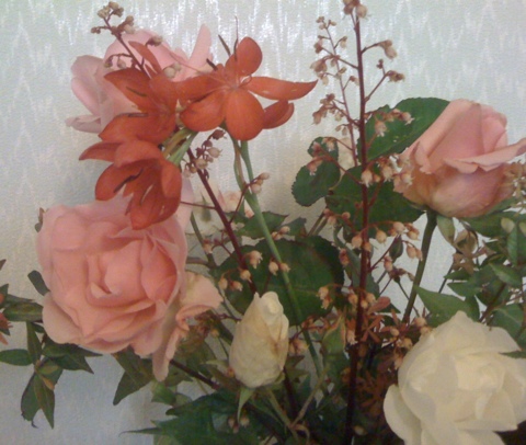 The garden is looking very dismal, things are collapsing in dark rotting heaps; looking for some flowers the other day was very depressing the roses that have been visible through the back door look tatty close up, I found one stem in a more sheltered area, a single decent stem of snowberry and one of Shizostylis which has left it rather too late to flower.