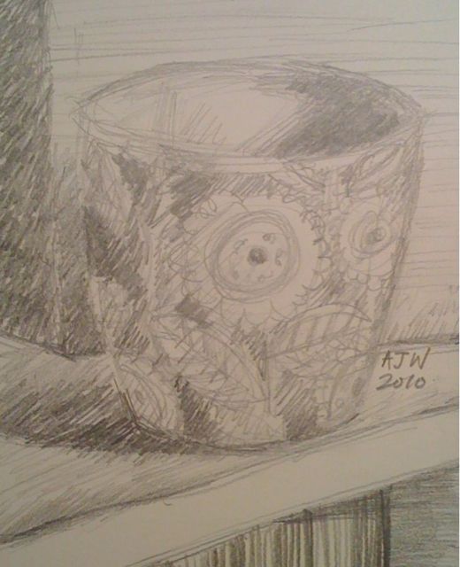 Today’s picture is simply a coffee cup in pencil. I also tried to sketch No2 son at the computer but I did not catch him in a still mood.