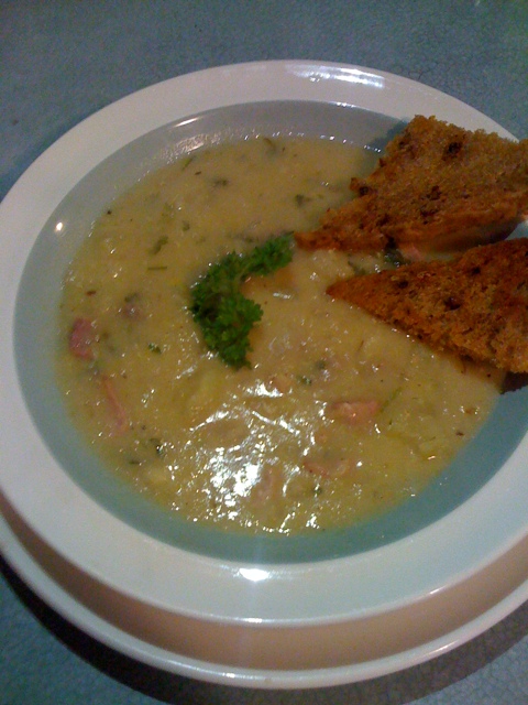 It is very cold today, warming food is vital; I put a jar of the water in which the ham had boiled into the fridge in case I need it again. The rest I tasted and made a judgement on the salt level, I then diluted it to taste and brought it to the boil. I added half an onion which was left over from something else, a cup of lentils (red) and boiled until it was getting smooth. I then added a cooking apple peeled and chopped. It had gone a little thin when I add the extra water so I thickened it with semolina ( I could have used ground lentils), I didn’t use cornflour as it could have made it a little too smooth and the soup needs to have a texture to it. Once the semolina was worked in gradually I boiled it for three minutes. Just before serving I diced a slice of the ham and added chopped parsley, winter savoury, black pepper and a pinch of sugar. Serve with sippets, they are easier to cook than croutons. The sippets were made from the heel end of a malted grain loaf; each slice cut in four and gently fried in olive oil. It helps if the bread is old and beginning to dry out. Funny the boys eat brown bread without a word when it is fried. There is still enough on the gammon joint for an evening meal. It keeps well in the fridge so I will leave it until Monday by which time I will have some leftover chicken from Sunday, at the moment I am thinking chicken and ham pie in a creamy sauce. I’d be thinking ham chicken and dried cep risotto if the fussy member of the family didn’t have quite such an anti-risotto stance.