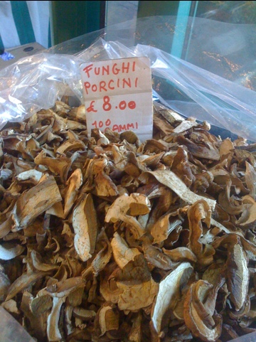 At the central market there were literally sacks of dried ceps or porcini, they varied in grade according to how perfect the dried slices were. The price went from 5 euro to 30 euro per 100 gramme. There were also blood oranges from Sicily and baby artichokes in heaps as well as fabulous piles of fresh damp salads in all sorts of colours. The buffalo mozzarella was really fresh and made a great lunch with olive bread.