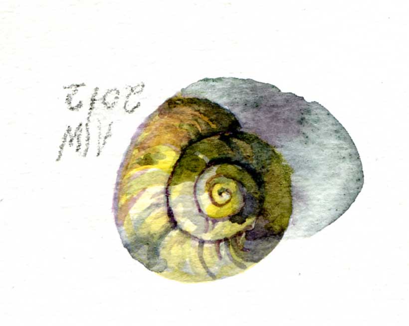 This is tiny, the snail shell is tiny and fragile, it is the sort that appears on the chalk. We are not on the chalk, but there are pieces of chalk and flint to be found in the garden soil….have to have been brought here whether by nature or man, I am not sure but I do wonder about ancient iron workings as sometimes I find bits of slag-iron. Perhaps there is enough calcium on the surface to support chalk loving weeds ( which we also have) and snails. I shall look for one of the stripy snail shells as they are very pretty close up. This is the 200th picture in my series of so called daily paintings. My mother predicted that it would become a burden if I continued with one a day, it has been important to relax about not being perfect both in the execution of the pictures and the production of the pictures. If I had not embarked on the concept I would probably have some paintings to show but not 200 wildly varied images that I do have.