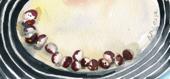 The beans on the plate are almost abstract and I am fine with that. They grew on the allotment and we have dried them for use in stews. They are rather good in stews they get very soft and smooth, better than shop bought dry beans. The plate is a bit of a disaster zone, but it’s an easy picture to set up and do, so I should try again.