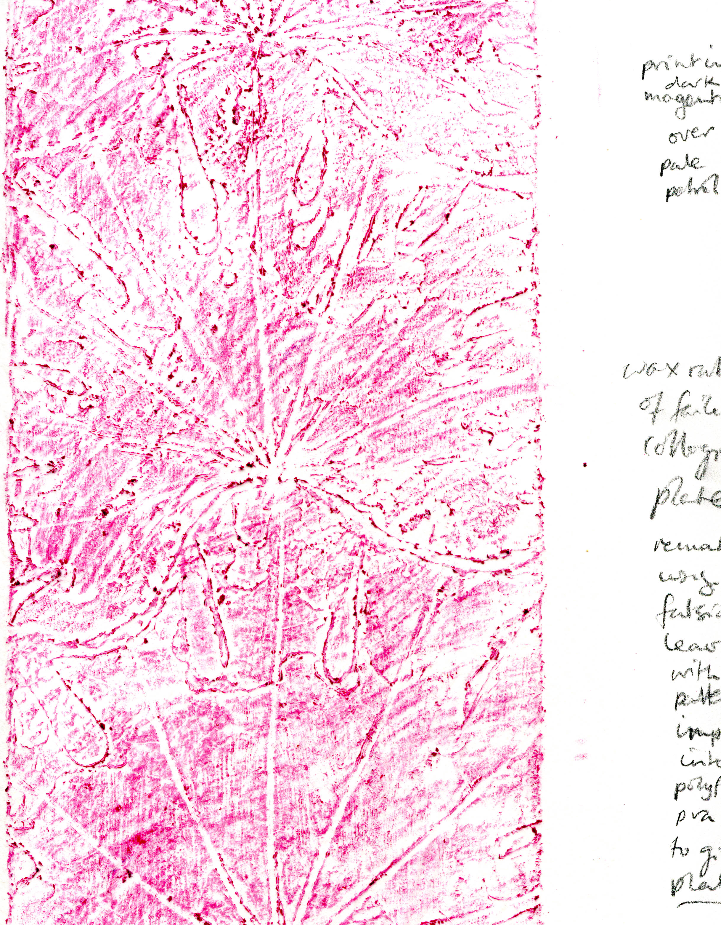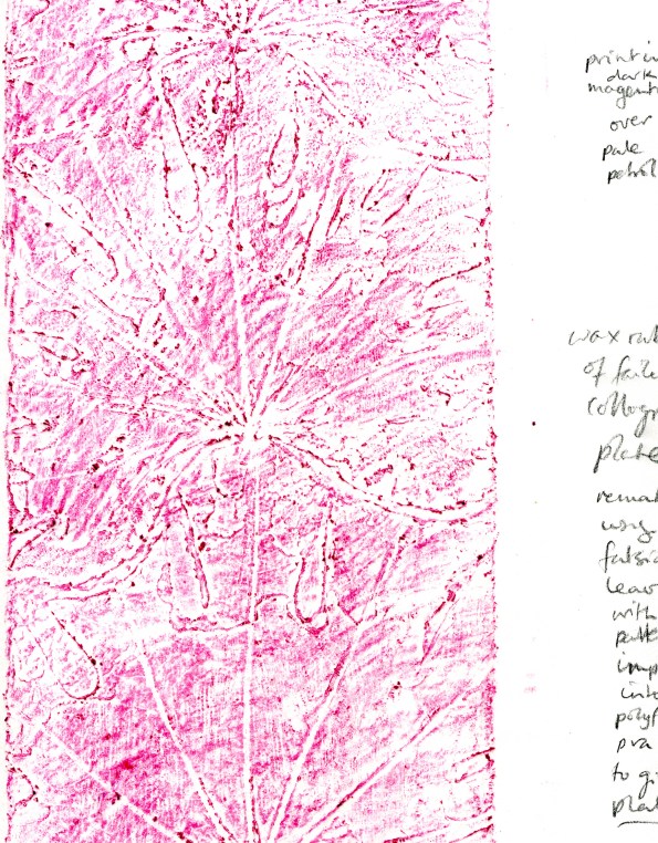 The print-like image is a wax rubbing of a collagraph plate which did not work. I made it to remind me of how to proceed when I sort out the technical problem caused by the waxy leaves. I have read of someone using a mixture of polyfilla and pva glue.