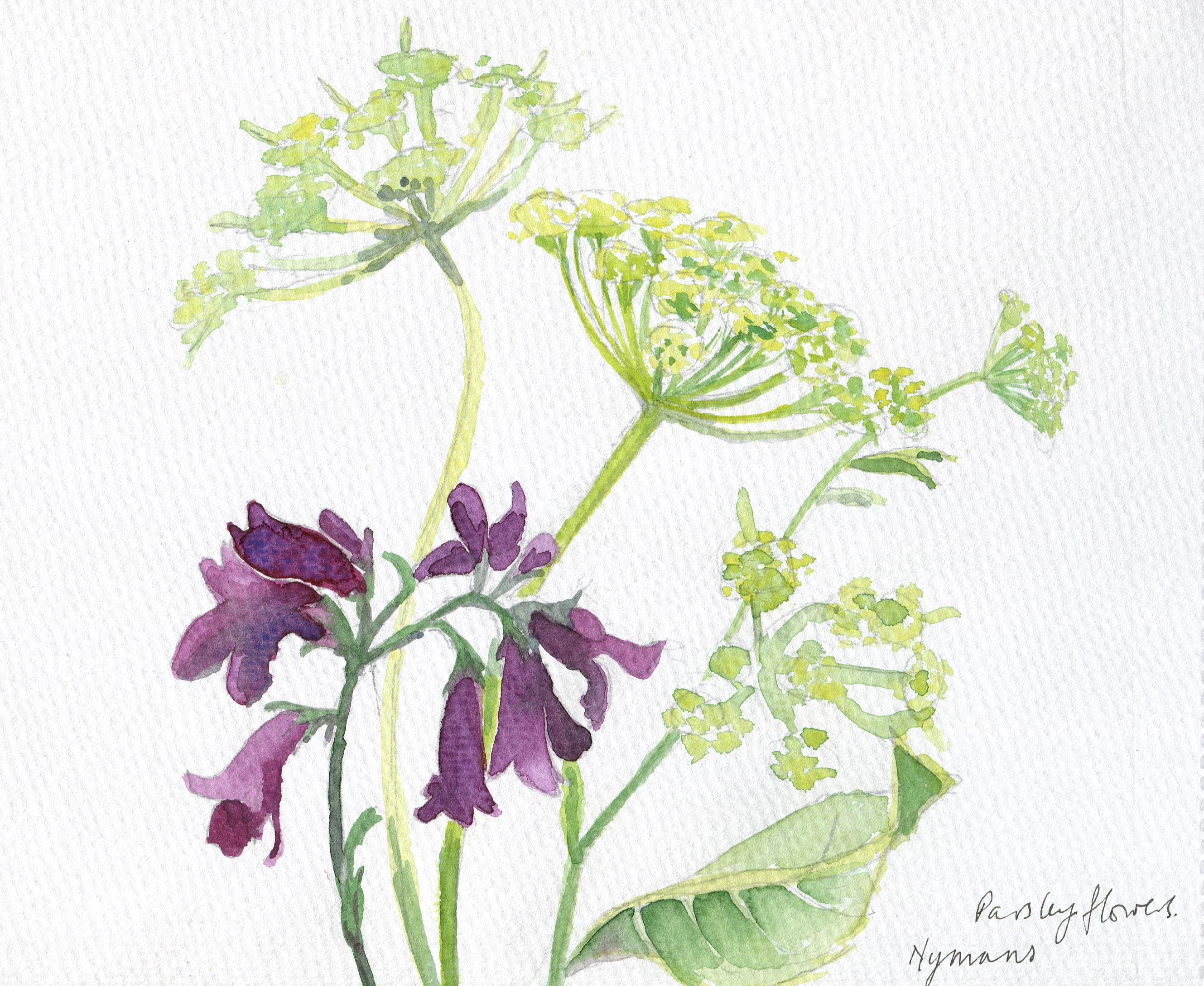 The flowers were in a vase and I was sketching them at the exhibition at Nymans but , being in rather a cramped corner I realised I had nearly flicked paint onto an art work of mine which I was trying to sell and I stopped painting!! The flowers came from my garden and having picked the stars of the bunch: Penstemon and creamy white roses, I needed fill and had none until I noticed that the parsley had gone to seed and was a lovely yellowy green a bit like Alchemilla mollis. The shapes in the flowers are lovely too . I finished it off in the studio just now.