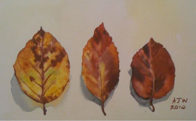 The painting is of some richly coloured Beech leaves with, I think, a Hornbeam leaf in the middle.