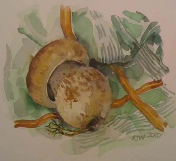 Returning to fungi, today I offer a painting of the beautiful sculptural ceps, they boast spectacular curves of the sort mostly found on women with large hips and bums. The photograph is of the more sinister and lumpy boletes that were in the lawn. These come up every year but there are more this year. Thinking about it they would have made a good subject to catch the eye of the judges for the Threadneedle prize had they been growing on an urban dual carriage way.