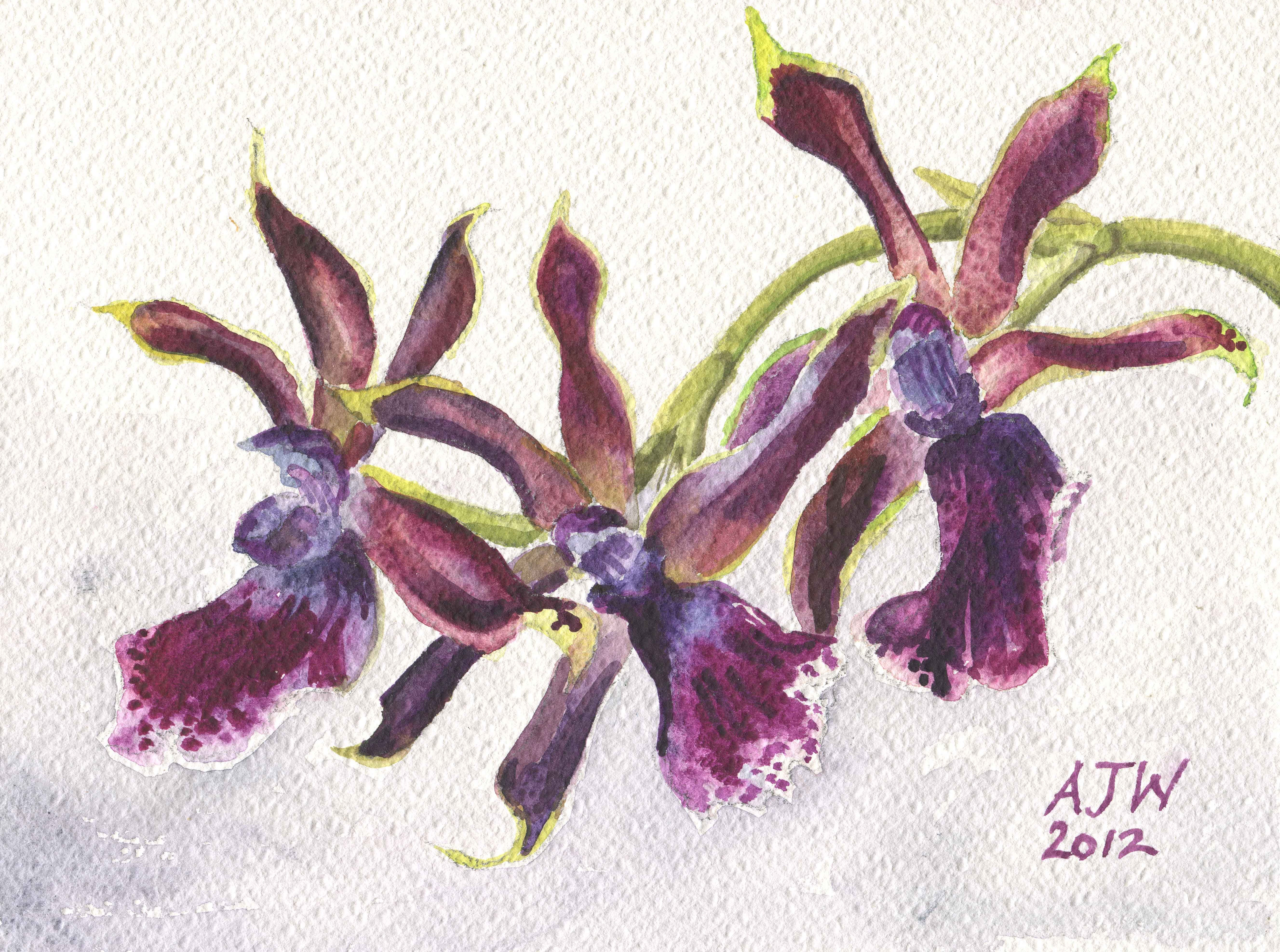 I get this orchid to flower once every few years it is scented and rather strange; there is something of the night about it. I found it for sale in, of all places to buy interesting plants, ASDA( or Walmart in the UK for international readers)! I bought two to decorate the house I was selling, the other orchid, a pretty coral pink, died years ago. This one seems to manage on the benign neglect I bestow on the rather more common moth orchid. The painting is drawn at about life size.