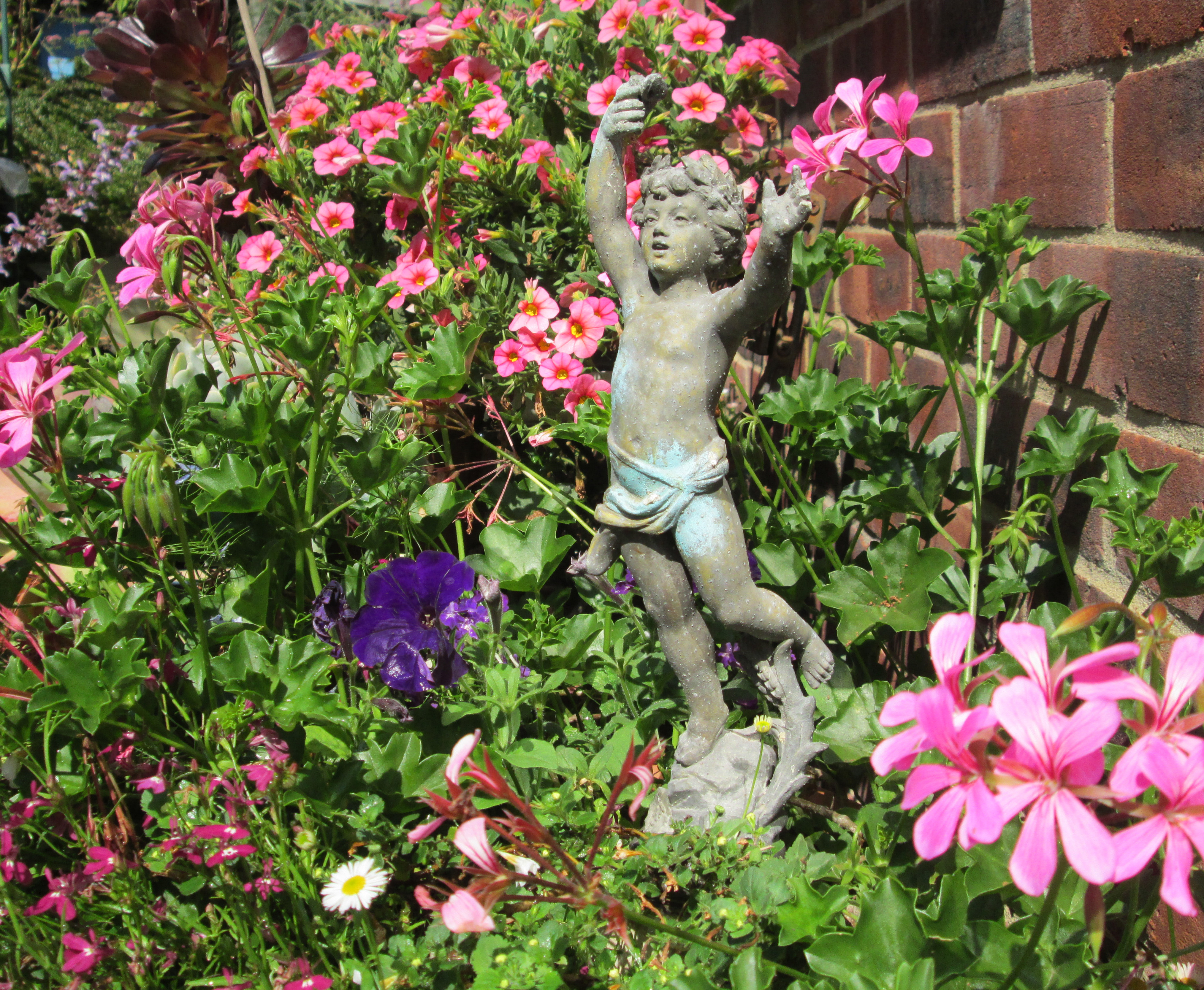 I have however put the old broken cupids back in the pots by the back door (see above). The plants hide the broken bases, my grandmother forced these figures on me one day( “Here,have these you can patch them up!”), and, as I had not wanted them and they were badly broken, they sat in a box unloved and unused for at least twelve years. There was no chance of my mending them not having any handy machinery for cutting the green onyx or alabaster which had fallen off the plaster bases and where to get the hideous stone anyway? I like them waving or drowning in the annuals though.