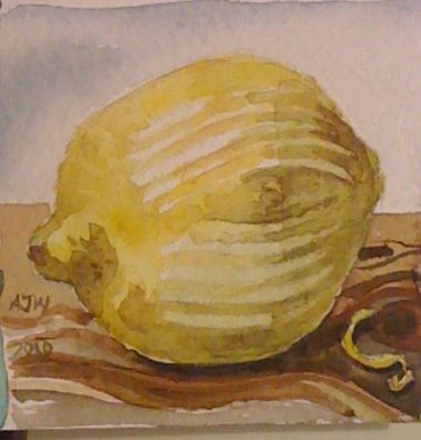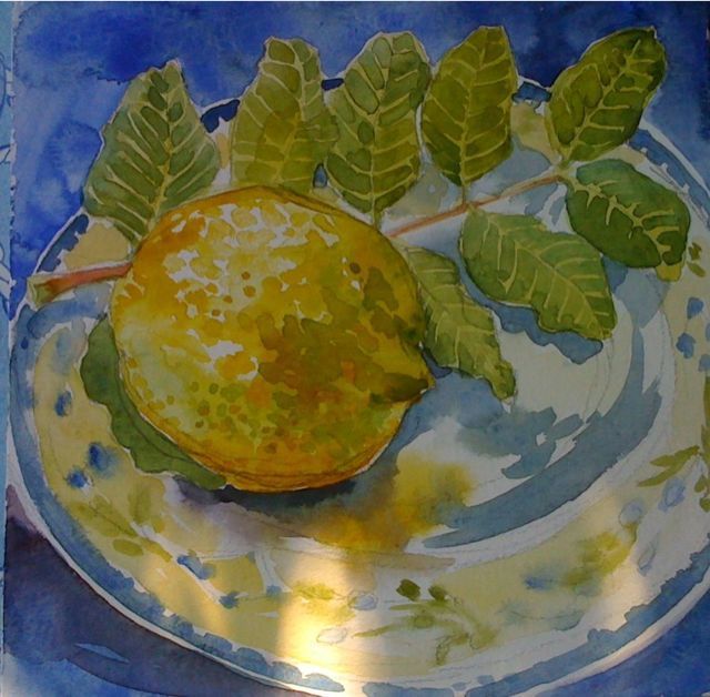 Today I painted two lemons on a blue cloth in watercolour just to see what they came out like…ok. Tomorrow I shall find something from the garden and also get some prints ready to sell. I shall continue to chase the deputy head who has not marked my sons course work since at least January 25th when he wrote to us complaining it had not been handed in…it was on his desk all the time we discovered after we had had the house turned upside down and the mother of ‘don’t lose your homework ever again’ rows. When I was at school I spent my time hiding from teachers who were chasing me for homework which I had not done , now I am chasing teachers for my sons homework they have not marked. I suppose the teachers are from my generation and we are all monumental skivers.