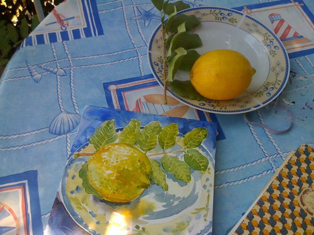 I did three paintings today, first the lemon, then the view of the monastry on an island in the lagoon from the cafe,then the view of the villa across the lagoon. While I did this I sat on the sea wall with my toes in the water. A fish with stripes and blue and orange splashes went along the rock edge.