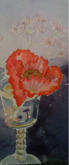 I had a better session today painting the same poppy which had not dropped its petals; when the weather is hot these poppies barely last a day. It reminds me of the wall paper my grandparents had in their bedroom, which was lush with poppies, there were stripes in the design in a bluish grey and like almost everything in their house, I loved it.