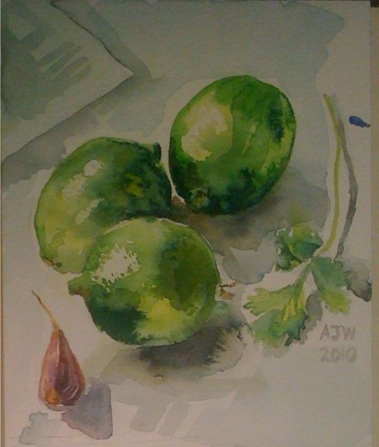 While it cooked I painted the limes. I added the other bits the coriander and garlic clove for compositional effect. They are sharper and linear to the bulk of the limes.