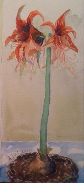 I am cheating here, I am off to visit my mother’s best friend in Shropshire so here is one I did earlier, I had to paint it while the flower was there as it wasn’t going to last. It’s a species Amaryllis and more insectoid than the big red ones raised so effectively in Holland. I have another one which is even stripier and very weird looking. Two days ago I finally saw the first butterfly of the year, a peacock, usually I see a brimstone butterfly first but no sign of one this year.