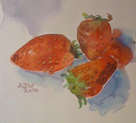 The strawberry theme continues although there is some background here. I have made this very loose and applied the paint wet on wet and then in some places flooded it with oxgall.