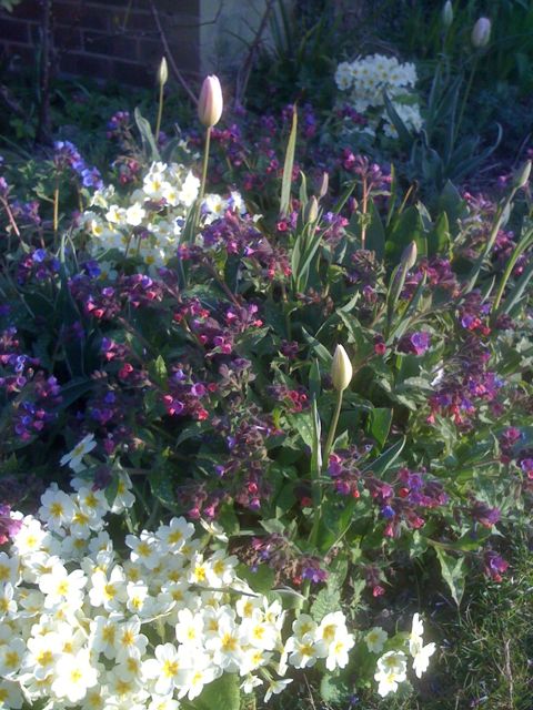 My star bit of permanent planting is at its peak, here is a sequence of photographs. First shows the tulips still in bud and yeaterday there they are open in the sun. You can just make out the striped leaves.